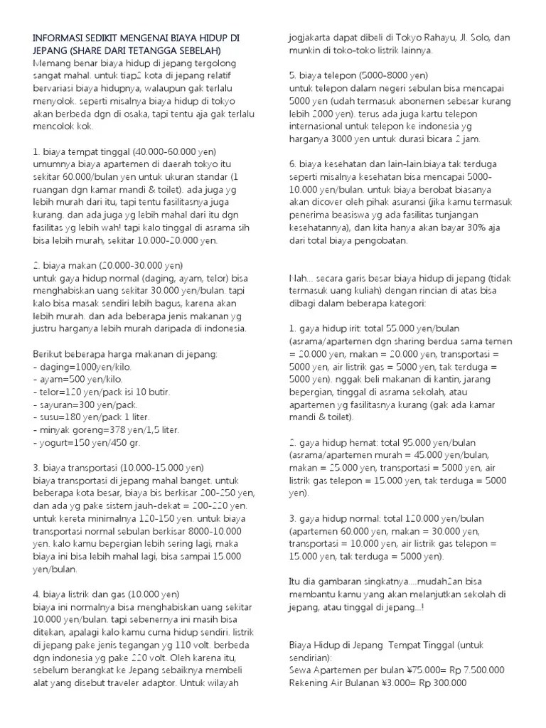 Semua orang tahu bahwa biaya hidup di jepang sangatlah tinggi. Di jepang, anda dapat berkeliling menggunakan jr pass (japan rail pass) yang dapat anda pesan di traveloka. Transportasi adalah biaya yang paling banyak dihabiskan selama di jepang. Bahkan banyak orang jepang sendiri banyak yang tidak mampu menyewa sebuah tempat tinggal dan lebih memilih berdiam diri di warnet. Ongkos kereta dan bus di sana tergolong mahal jika dibandingkan dengan indonesia. Paket sarapan di kafe dapat dibeli seharga ¥ 400. Jika kurs 1 yen jepang sama dengan rp138,97 (oktober 2020) maka total biaya minimum yang diperlukan untuk kuliah dan hidup di jepang adalah sebesar 2.104.000 x rp138,97 = rp292.392.880 per tahun, sedangkan perkiraan biaya maksimum yang diperlukan untuk tinggal di negara tersebut adalah 6.760.000 x rp138,97 = rp939.437.200 per tahun. Nov 09, 2021 · november 9, 2021 pada kisaran gaji dan rincian biaya hidup di jepang, hingga rp 24 juta per bulan! Oct 13, 2020 · jika hanya main seputaran tokyo biayanya bisa hanya 9 jutaan! 17.775.387 per bulan jika 1 yen … Seperti yang dilansir dari expatistan, jepang berada di posisi ketiga sebagai negara dengan biaya hidup paling mahal di asia tahun 2020. Meski begitu, pentingnya kamu mengetahui biaya hidup di jepang agar rencana kamu berjalan lancar. Satu lagi biaya pengurusan visa ke jepang adalah sekitar rp 300,000 (plus agent fee) perlu anda …